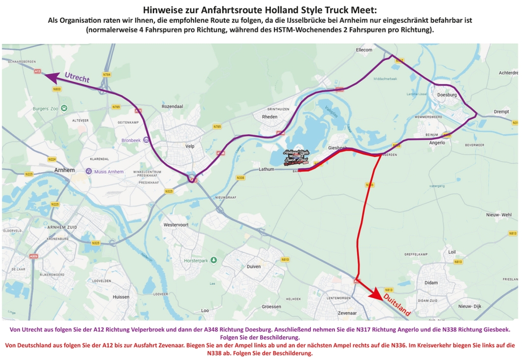 Aufgrund der Bauarbeiten an der IJsselbrücke auf der A12 raten wir Ihnen, die unten stehende Routenbeschreibung sorgfältig zu prüfen, da sie während des Wochenendes des Holland Style Truck Meet gilt.